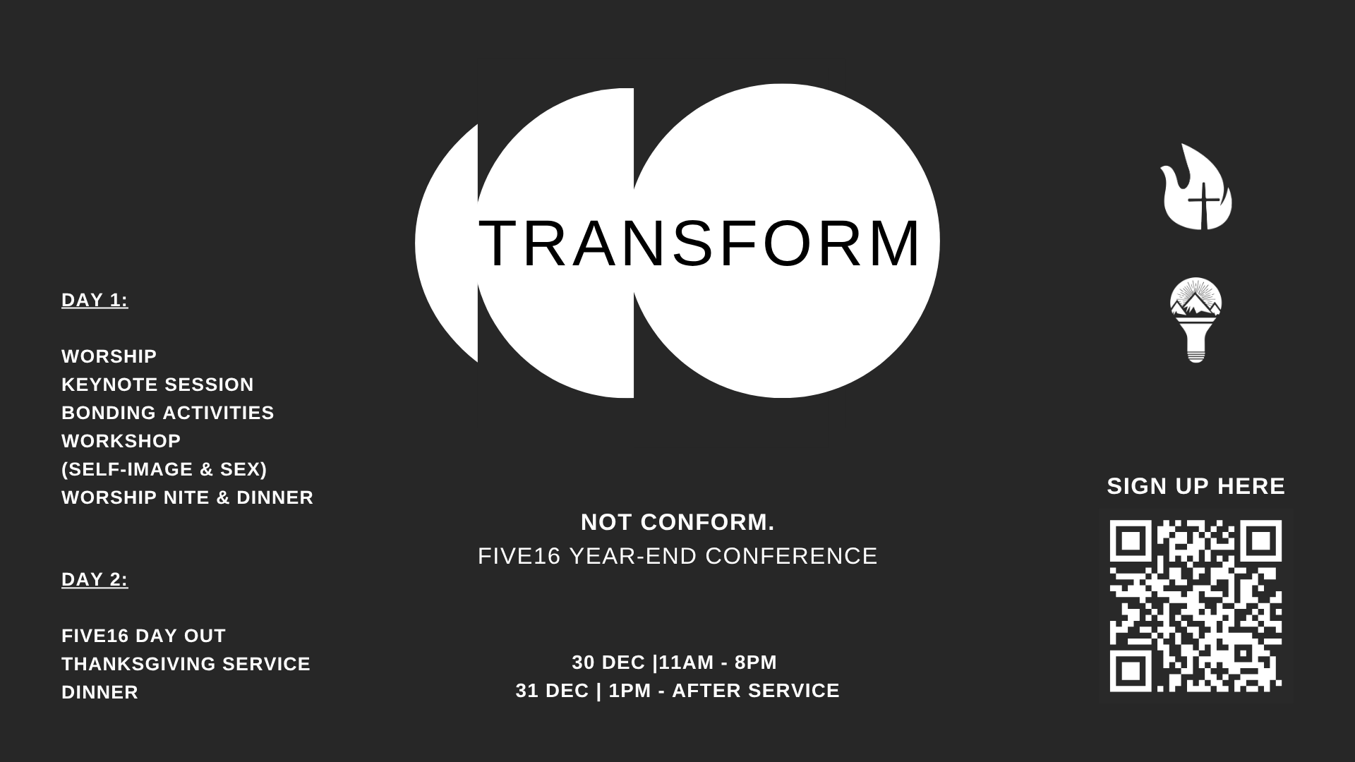 Sign up for our biannual End-of-Year Conference as we discover how we can be transformed more into Christ-likeness instead of being conformed to the patterns of this world!